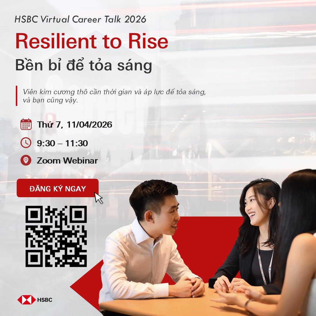 Hãy cùng HSBC Virtual Career Talk 2026 - Resilient to Rise khám phá hành trình sự nghiệp của bản thân mình. Tham gia sự kiện, bạn sẽ được chia sẻ về: