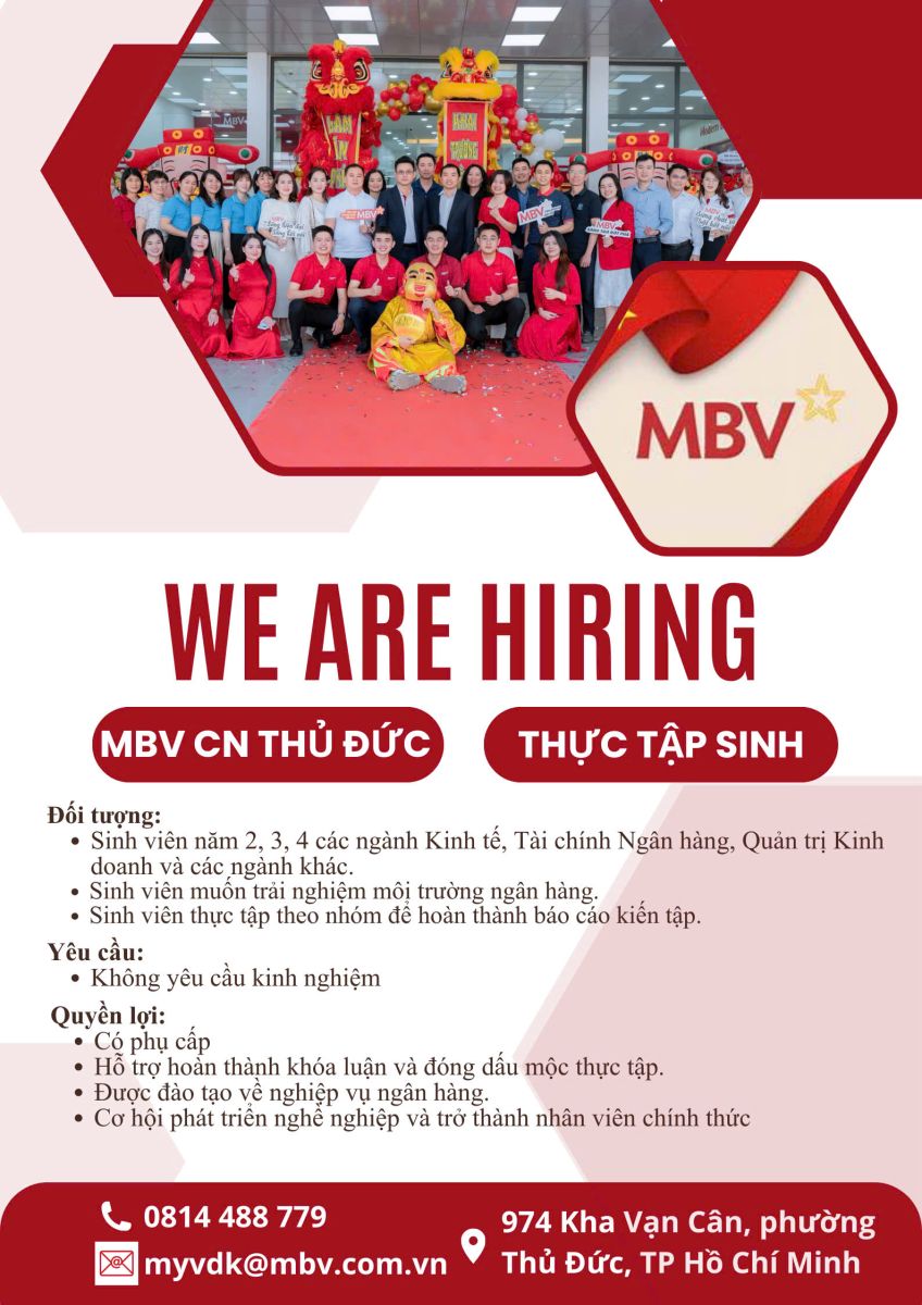 Ngân hàng MBV - Chi nhánh Thủ Đức hiện đang triển khai chương trình tuyển dụng Thực tập sinh/ Cộng tác viên - Phòng KHCN